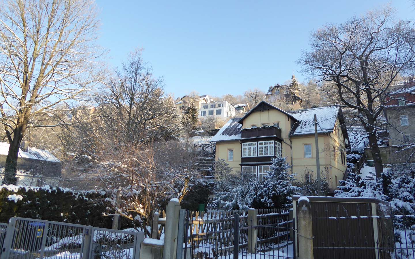 Our house is situated half way up the Elbe mountain slopes within 5–10 mins. by foot from Körnerplatz. From there (just by the landmark “Blaues Wunder” bridge) you can easily reach the city centre with very reliable public transport by changing at Schillerplatz on the other side of that bridge, within another approx. 20 mins.